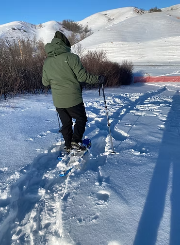 He is telling me, that I’m not going on the lake and refusing.  I was a little bit upset because I really wanted to go on the lake.  When we arrived at my sisters and got dressed for snowshoeing, he heads out towards the road. My thoughts were that I will follow him for a while and then later I’ll go on the lake myself, but to my surprise, once we got up the hill, he starts to go down towards the lake in between some houses.   To my shock he goes on the lake only near the edge though, which was an accomplishment. Way to go Andrew!